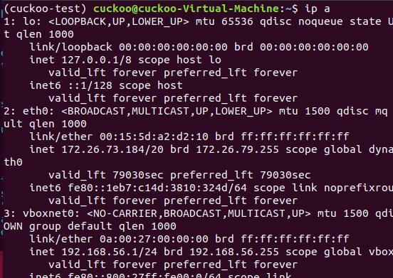 /home/cuckoo/.cuckoo/conf/routing.conf 에 들어가서 internet = none을 internet = eth0 (host adapter) (ip a 를 입력해서 나오는 adapter 로 입력해줌)