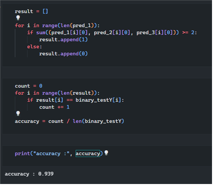 위에서 사용했던 Feature들을 각각 좋은 퍼포먼스를 보여준 CNN Model에 학습시킨다. 이후 악성과 정상 중 한 개가 결정되어 모델별로 예측한 값이 3개가 나오게 되는데 그중 더 많은 표를 받은 쪽이 선택되어 악성, 정상을 가리게 된다. 예를 들어 파일1에 대한 결괏값이 정상, 악성, 악성이라면 이 파일에 관한 결과는 악성이 더 많으므로 악성 파일로 최종 판단하게 된다. 이러한 방식 말고 다른 방식의 앙상블 모델도 존재한다.