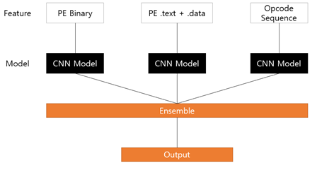 나는 PE Structure, 다른 팀원들은 Binary Data, Opcode를 Feature로 사용하여 실험했는데 이 3개의 모델을 앙상블을 이용하여 합쳐서 더 높은 성능을 가지는 모델을 구현해보고자 했다.